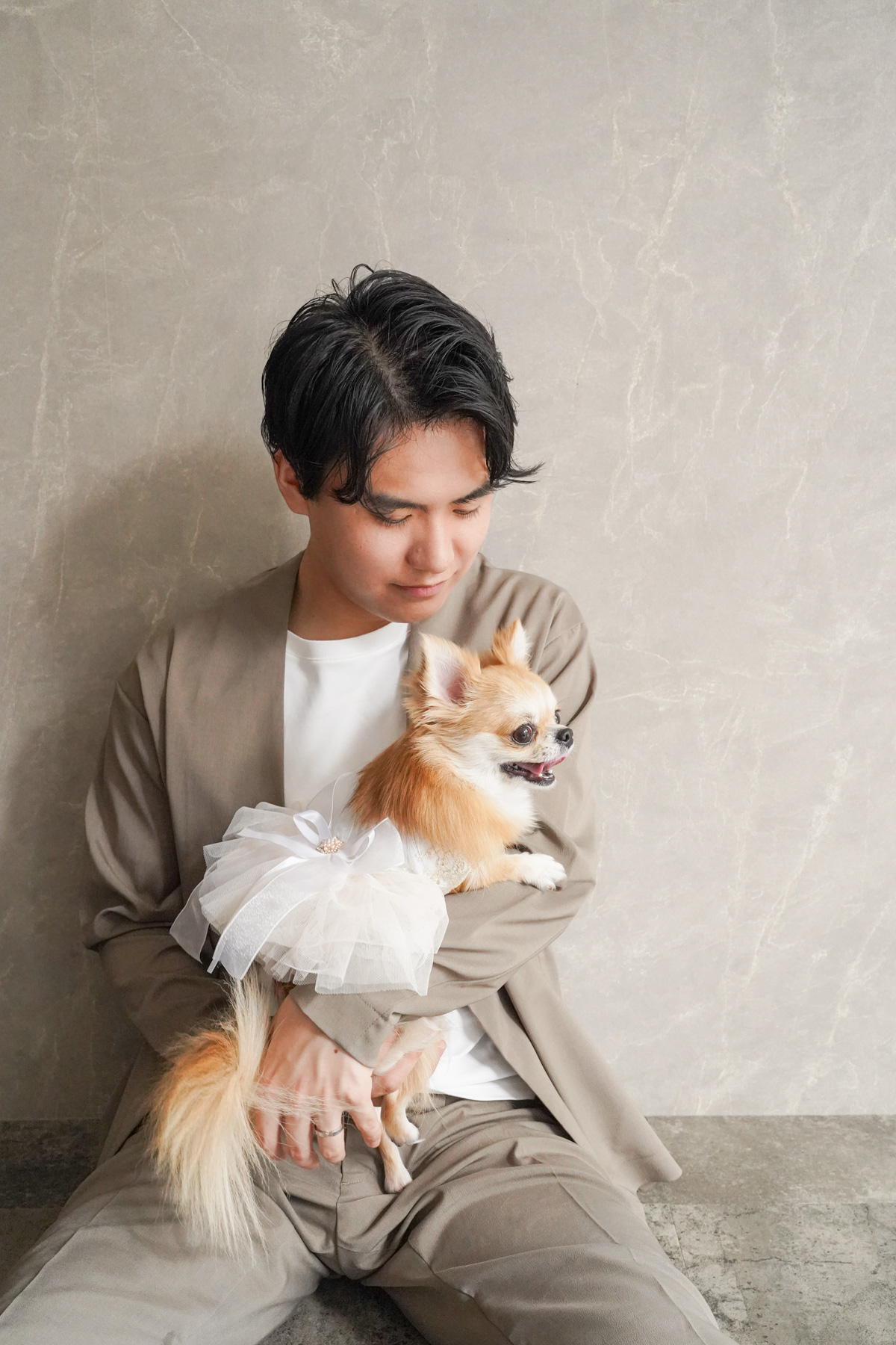 スタジオの壁はグレージュとモダンホワイトの2面。モデルルーム調のスタジオ全てがペットフレンドリー!危なくないよう高さのないスツールや大き目の柔らかいクッションなど、おしゃれでスタイリッシュな家具を多数揃えました。