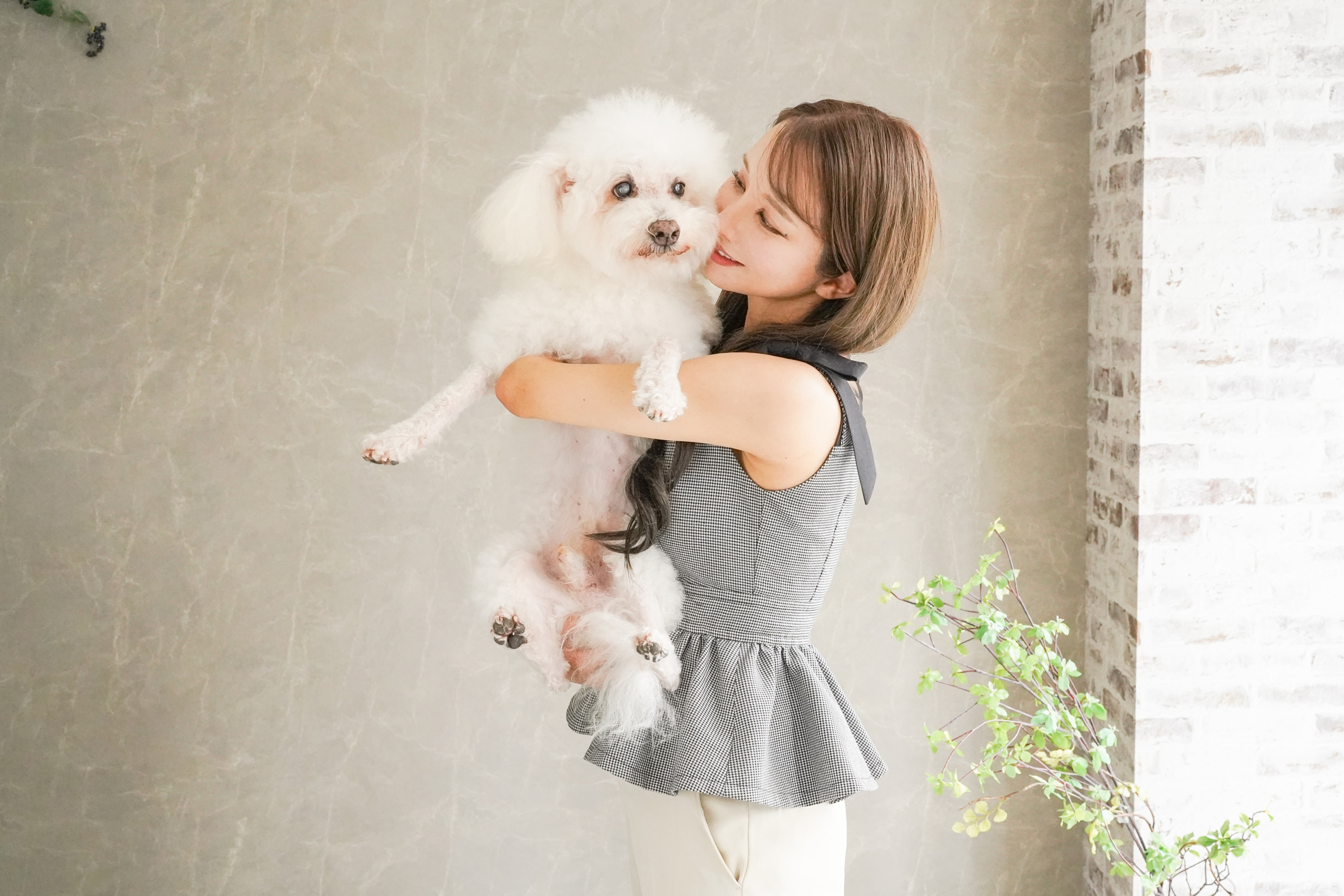 スタジオの壁はグレージュとモダンホワイトの2面。モデルルーム調のスタジオ全てがペットフレンドリー!危なくないよう高さのないスツールや大き目の柔らかいクッションなど、おしゃれでスタイリッシュな家具を多数揃えました。